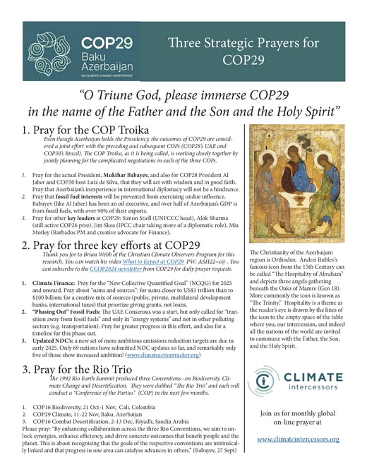 New life is still possible for old processes. In this story, Sarah famously laughs when she overhears the Lord say that in one year’s time, she will bear a son. “Will I really have a child, now that I am old?” (18:13). Twenty-nine, as in COP29, doesn’t feel like an old age for a string of climate summits. The Paris Agreement itself only went into full effect four years ago. Nonetheless, I sense a fatigue among veteran climate negotiators and activists. Many stalwarts of previous COPs, like Christiana Figueres the architect of the Paris Agreement, aren’t even going to COP29. Regardless, I think we can say that the Industrial Age is old, and “late stage capitalism” is called late stage for a reason. As promised or predicted, Sarah and Abraham did have a child in their old age. They named him Isaac which means “one who laughs or rejoices.” There is no indication that his birth was a miracle in the traditional sense. Isaac was conceived the way all of us were, and yet we are led to believe that God came alongside this old couple and strengthened human processes. Our second set of strategic prayers for COP29 are for the three key efforts of the negotiations: climate finance, fossil fuel phase-out, and ambitious NDCs. The negotiations at a COP are a decidedly human process, but we can pray that God will come alongside negotiators so that in the end all of his creation may rejoice.